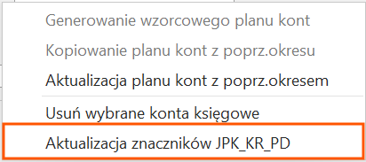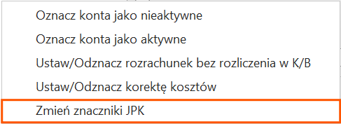 Na liście w menu kontekstowym oraz po rozwinięciu strzałki obok przycisku dostępna jest operacja seryjna Zmień znaczniki JPK. Funkcja pozwala na dodanie, zmianę oraz usunięcie znaczników JPK na zaznaczonych kontach księgowych.