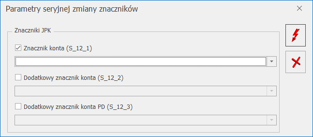 Przycisk pioruna uaktywnia się po zaznaczeniu przynajmniej jednej z trzech dostępnych opcji: Znacznik konta (S_12_1), Dodatkowy znacznik konta (S_12_2), Dodatkowy znacznik konta PD (S_12_3).Zapisy księgowe