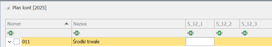 Na liście kont księgowych z poziomu menu Księgowość/ Plan Kont dostępne są kolumny S_12_1, S_12_2 i S_12_3. Kolumny pozwalają na weryfikację, jakie znaczniki zostały przypisane na formularzach kont księgowych na zakładce [JPK]. Kolumna S_12_1 jest domyślnie widoczna. Pozostałe kolumny są możliwe do wyciagnięcia na listę za pomocą opcji Wybór kolumn. Opcja Wybór kolumn jest dostępna po naciśnięciu prawym klawiszem myszy na nazwę jednej z kolumn.
