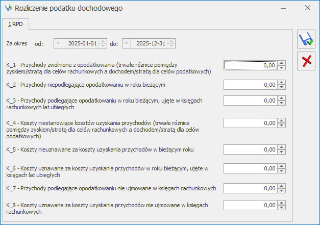 Na oknie znajdują się kwoty wyliczone na podstawie definicji zestawienia systemowego o symbolu RPD, które jest dostępne w menu Księgowość / Zestawienia księgowe/ zakładka [Systemowe].