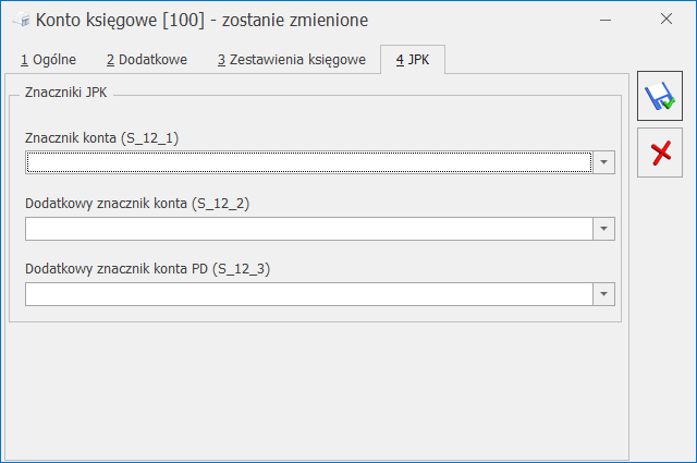 Na formularzu konta księgowego w zakładce [JPK] istnieje możliwość przypisania znaczników JPK: S_12_1, S_12_2 oraz S_12_3.