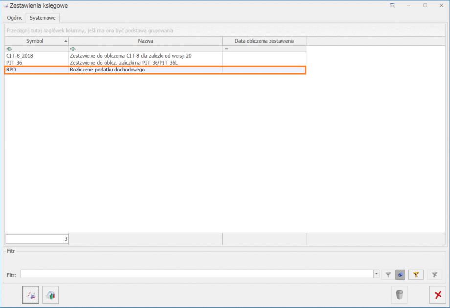 Z poziomu menu Księgowość/ Zestawienie księgowe, na zakładce [Systemowe] znajduje się zestawienie pomocnicze RPD (Rozliczenie podatku dochodowego). Zestawienie to może być wykorzystane do obliczenia kwot przychodów oraz kosztów na Rozliczeniu podatku dochodowego będącego częścią pliku JPK_KR_PD.