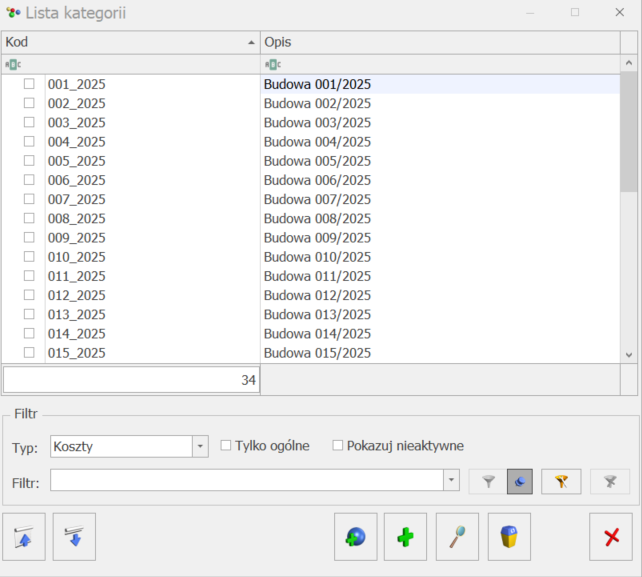 Można również zamiast zakładania poszczególnych kategorii dla każdej budowy zdefiniować wymiar o typie Opisowy o nazwie BUDOWY i do niego dodawać kolejne elementy, które będą poszczególnymi budowami.