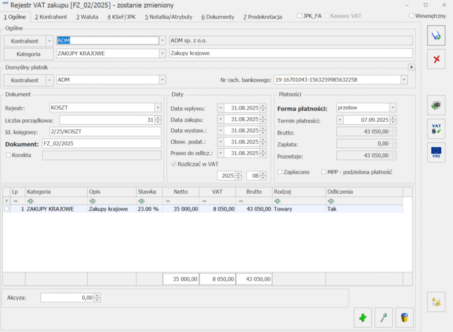 Mając fakturę zakupu na 35000 możemy ją rozpisać następująco: