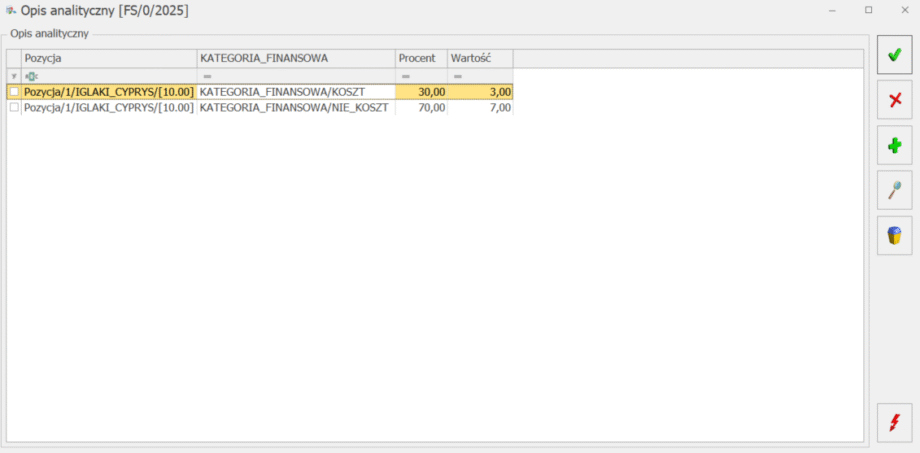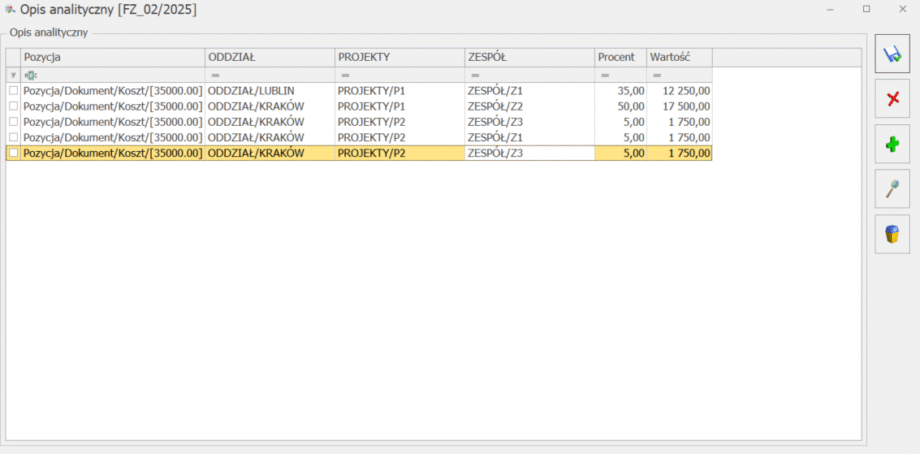 Po zmianie kwot na pozycji, dodaniu nowej pozycji lub usunięciu pozycji na dokumencie należy ponownie wprowadzić opis analityczny.