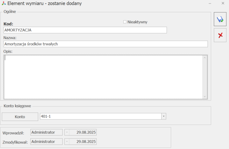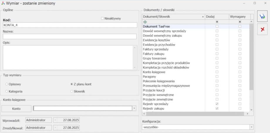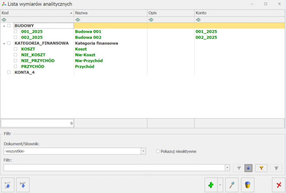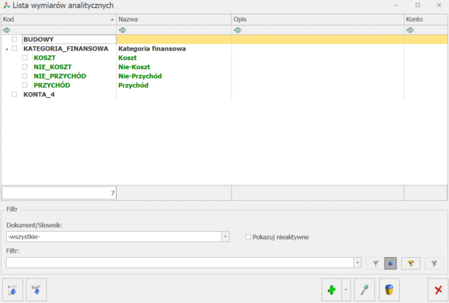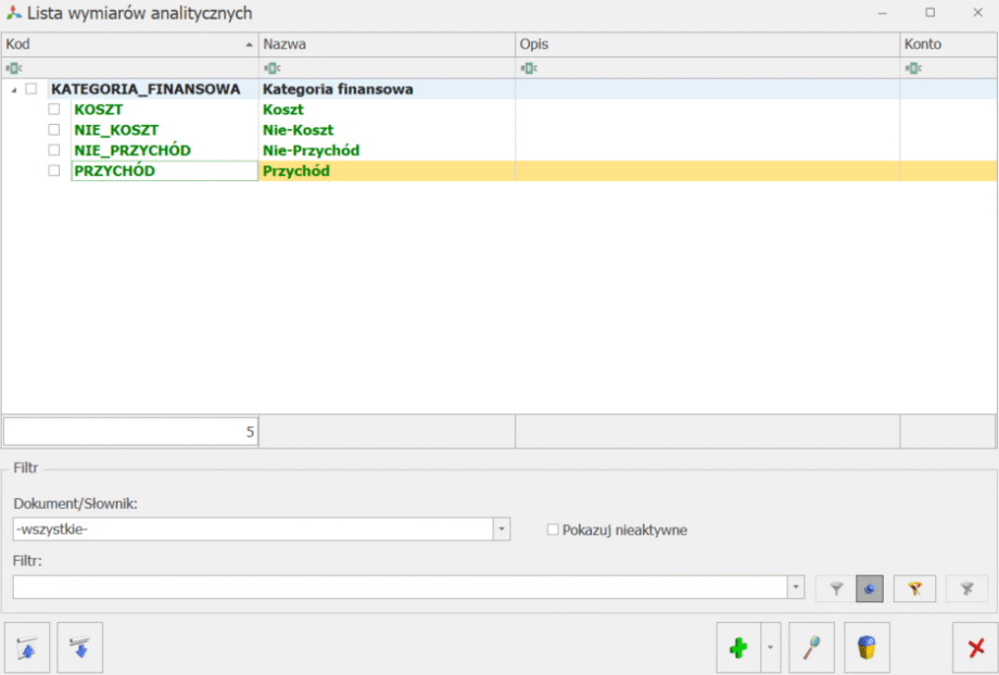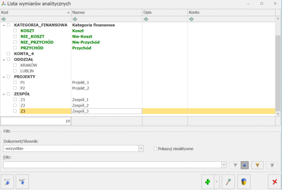 - Dodaj wymiar – pozwala na dodanie formularza wymiaru analitycznego,
