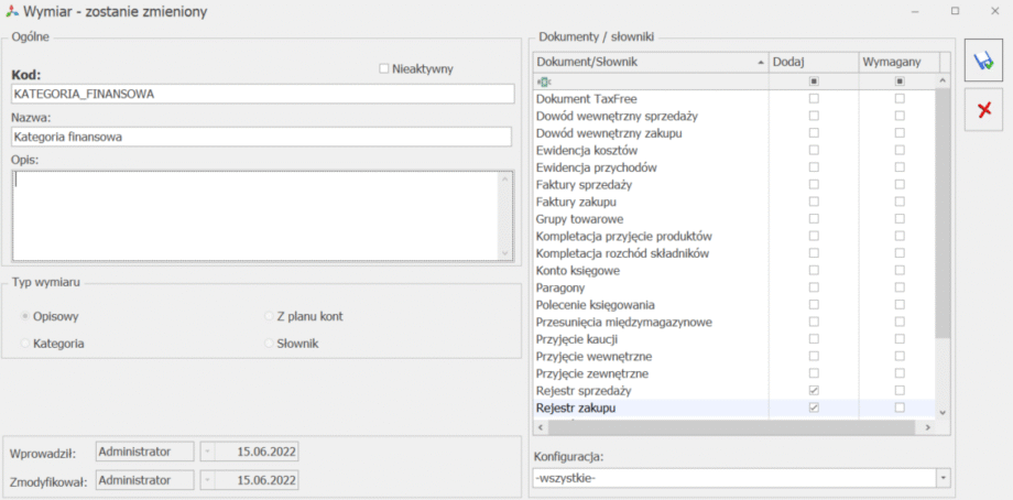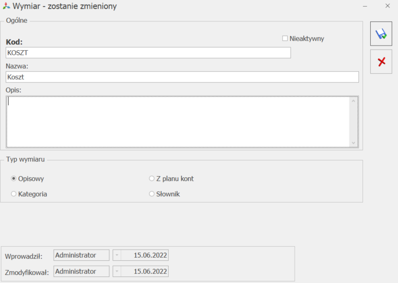 Zmiana typu wymiaru nie jest możliwa jeżeli wykorzystano jego element do opisania dokumentu/słownika, a w przypadku wymiaru o typie Opisowy nie jest również możliwa jeżeli dodano do niego podwymiar/element.