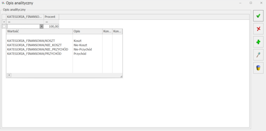 Okno opisu analitycznego na dokumencie zawiera domyślne kolumny: Pozycja, Procent oraz Wartość. Dla każdego typu dokumentu w kolumnie Pozycja do wyboru są inne wartości. Nie można zapisać opisu analitycznego na dokumencie bez uzupełnienia kolumny Pozycja.