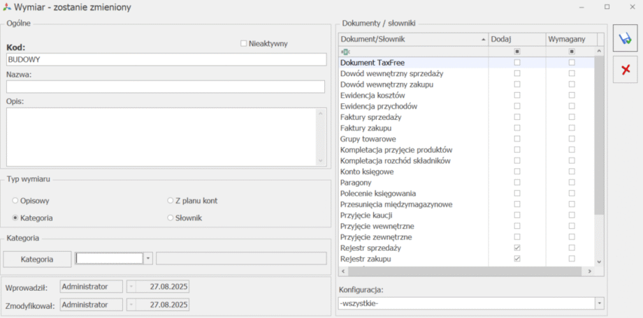 Na formularzu wymiaru użytkownik powinien wskazać, na jakich dokumentach/słownikach wymiar może zostać wykorzystany.