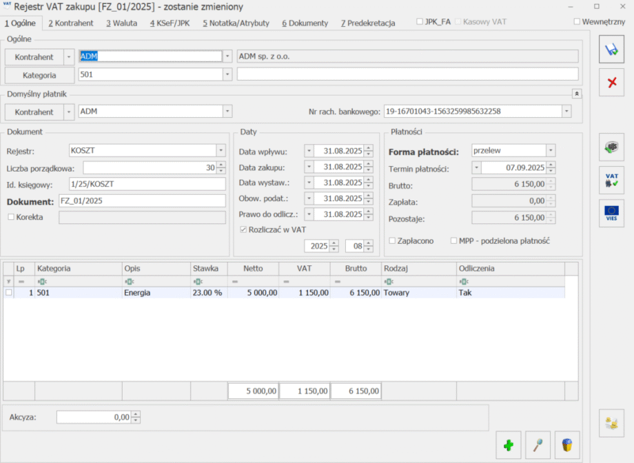 Na dokumencie można również wykorzystać kategorię nagłówka, która byłaby np. numerem konta „5”. Czyli na liście kategorii pojawiłyby się również „5”.