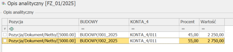 Aby uzyskać taką sytuację można właśnie wykorzystać opis analityczny oraz kategorie – gdzie wymiarami będą wymiar o typie kategoria (BUDOWY) i drugi wymiar o typie z planu kont (KONTA_4).