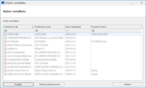 Jeżeli na oknie wyboru sposobu uwierzytelniania zostanie wybrana opcja Podpis kwalifikowany / Pieczęć elektroniczna i wcześniej nie był wybrany żaden podpis/pieczęć, pojawi się okno z listą certyfikatów dostępnych w systemie Windows: