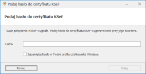 Jeżeli wybrana została opcja uwierzytelnienia za pomocą certyfikatu KSeF, ale połączenie wygasło, przy próbie połączenia z KSeF pojawi się prośba o podanie hasła do certyfikatu: