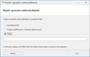 Wybór sposobu uwierzytelnienia odbywa się w momencie połączenia z KSeF – przy wysyłaniu bądź pobieraniu faktur. Wówczas operator dokonuje wyboru, czy chce uwierzytelnić się poprzez certyfikat KSeF, podpis kwalifikowany/pieczęć elektroniczną czy przez token:
