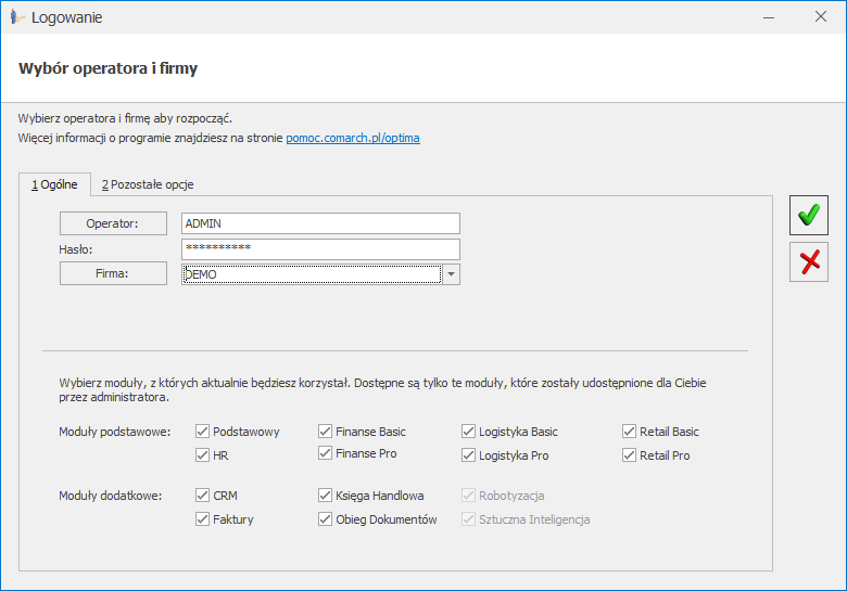 Te ustawienia wpływają na proces logowania. Na oknie logowania automatycznie zaznaczone będą moduły przypisane do Użytkownika na karcie operatora. Dostępne funkcjonalności w tych modułach są dodatkowo ograniczone tylko do tych, do których użytkownik ma uprawnienia.