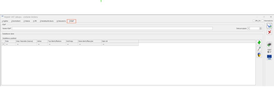 3. Rejestr VAT. KSeF.W Rejestrze VAT zakupu oraz sprzedaży dodano nową zakładkę KSeF, umożliwiającą wskazanie numeru KSeF, daty przyjęcia oraz przypisanie dodatkowego podmiotu. Dane te są automatycznie przenoszone z faktur wystawionych w module Handel, o ile zostały tam wcześniej uzupełnione. Istnieje również możliwość ręcznego wprowadzenia tych informacji bezpośrednio w rejestrze.