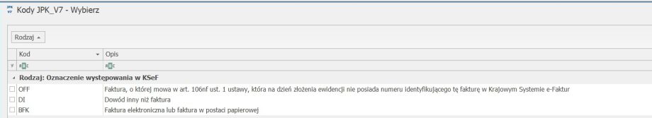 2. Nowe kody JPK. Na liście kodów JPK dodano nowe kody, potrzebne do opisania dokumentów wystawionych w trybie awaryjnym: