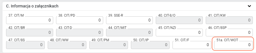 - Na formularzu deklaracji CIT-8(34) dodano nowe pole 51a. Informacja o załącznikach CIT/WOT