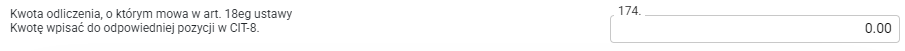 - Na formularzu załącznika CIT-8/O(20) dodano nowe pole 174 Kwota odliczenia, o którym mowa w art. 18eg ustawy.