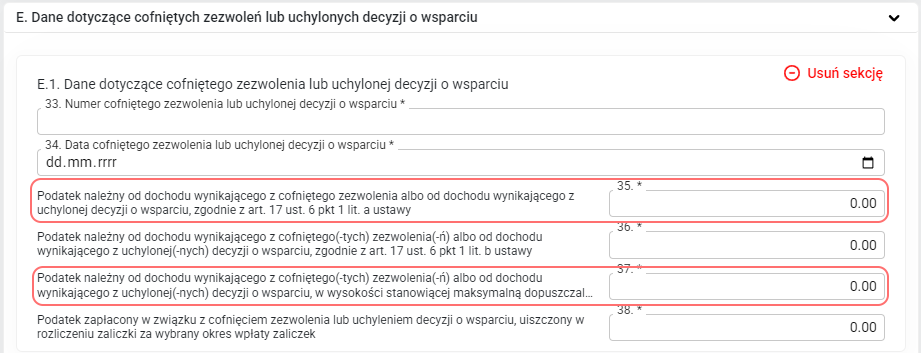 - Na formularzu załącznika CIT-8S(7) w sekcji E dodano dwie nowe pozycje: 35 Podatek należny od dochodu wynikającego z cofniętego zezwolenia albo od dochodu wynikającego z uchylonej decyzji o wsparciu, zgodnie z art. 17 ust. 6 pkt 1 lit. a ustawy i 37 Podatek należny od dochodu wynikającego z cofniętego(-tych) zezwolenia(-ń) albo od dochodu wynikającego z uchylonej(-nych) decyzji o wsparciu, w wysokości stanowiącej maksymalną dopuszczalną pomoc publiczną, zgodnie z art. 17 ust. 6 pkt 2 ustawy.