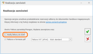 • Data i nr zamówienia z RO – zaznaczenie parametru powoduje, że informacje o numerze oraz dacie zamówienia pochodzące z powiązanego dokumentu rezerwacji odbiorcy (RO) są automatycznie przenoszone na fakturę do zakładki [KSeF], a następnie przesyłane do KSeF w dedykowanych polach.