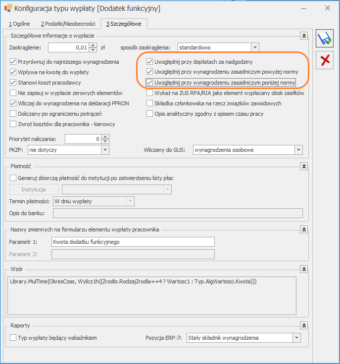 W celu oznaczenia dodatku, który ma być uwzględniany przy wyliczeniu wynagrodzenia za nadgodziny w konfiguracji typu wypłaty na zakładce [Szczegółowe] należy zaznaczyć odpowiedni parametr / parametry:
