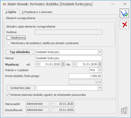 Jeśli na formularzu dodatku nie będzie wskazany symbol listy płac, to dodatek pojawi się w pierwszej wypłacie etatowej pracownika za dany miesiąc, niezależnie od tego, jaki symbol ma lista płac, na której są naliczane wypłaty etatowe.