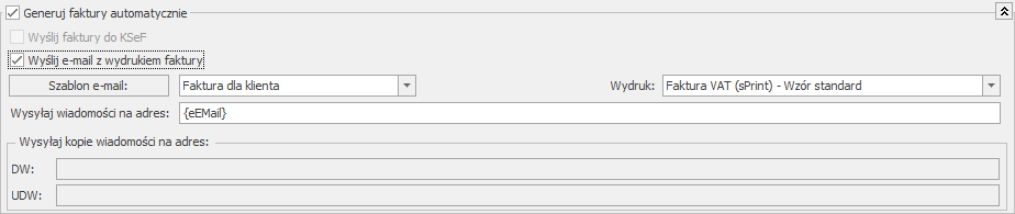Po jego zaznaczeniu aktywne stają się parametry Wyślij faktury do KSeF oraz Wyślij e-mail z wydrukiem faktury W obu powyższych przypadkach operator ma do wyboru dwie ścieżki: Przebieg procesu i weryfikacja UPO Parametr Wyślij e-mail z wydrukiem faktury – faktury generowane cyklicznie przez automat będą równocześnie wysłane do klientów. Dla wysyłanych faktur należy wybrać wzór wydruku i szablon wiadomości e-mail. Dostępne szablony i wyduki wyświetalne są dla Faktury Sprzedaży/ Faktury Pro Forma – w zależności od typu dokumentu wybranego na wzorcu. Domyślna lista wydruków dla Faktury Sprzedaży/ Faktury Pro Forma jest ograniczona w stosunku do listy wydruków dostępnej z formularza, nie zawiera m.in. tekstowych i seryjnych. Przy automatycznym generowaniu faktur cyklicznych wydruk typu XML musi mieć w konfiguracji wydruków zaznaczoną opcję łączenia plików PDF w jeden dokument. W polu Wysyłaj kopie wiadomości na adres widoczne są adresy e-mail UDW powiązane z wybranym szablonem e-mail. W przypadku automatycznego generowania faktur cyklicznych na dokumenty wynikowe daty i kurs ustalone na wzorcu w walucie obcej przenoszą się tak samo jak przy ręcznym wystawianiu dokumentów walutowych. Dla kursu ręcznego pobierane jest notowanie ustalone na wzorcu. W przypadku braku odpowiedniego kursu waluty w logu operacji automatycznych pojawi się odpowiedni komunikat z informacją. Na liście wzorców faktur cyklicznych dostępna jest dodatkowa kolumna Automat przyjmująca wartości Tak/ Nie, gdzie operator może sprawdzić, które faktury są generowane automatycznie, a które z wykorzystaniem Serwisu Operacji Automatycznych.