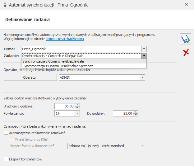 Dla każdej z baz firmowych podpiętych do bazy konfiguracyjnej można włączyć automatyczną synchronizację z wybraną usługą oraz określić w jakich godzinach oraz z jaką częstotliwością synchronizacja będzie się odbywać.