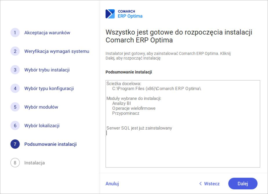 - Sprawdzenie obecności wymaganych komponentów do instalacji systemu Comarch ERP Optima.