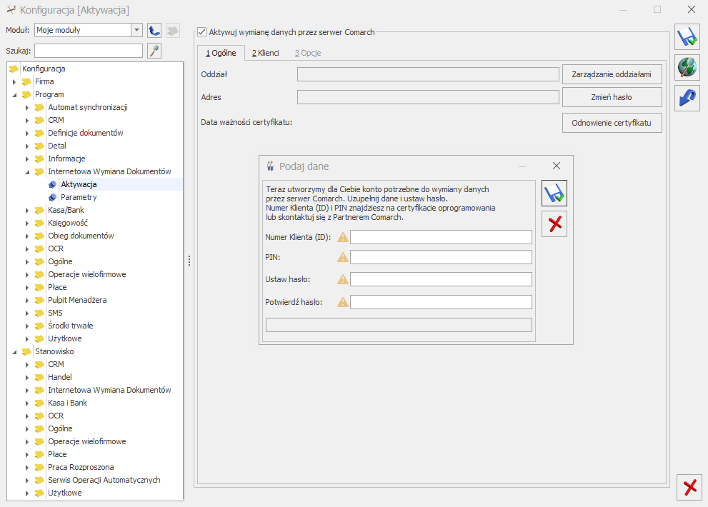 - Numer Klienta (ID) – numer identyfikacyjny Comarch Biura Rachunkowego (widoczny na certyfikacie rejestracji oprogramowania),