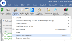 Wraz z programem Comarch ERP Optima instalowany jest edytor Comarch sPrint, którym operator może się posłużyć do stworzenia nowego lub edycji istniejącego wydruku. Aby dokonać edycji wydruku, należy przejść do wybranej listy dokumentów (np. listy faktur zakupu) lub wybranego formularza dokumentu (np. formularza faktury zakupu), następnie rozwinąć Wydruk danych lub Podgląd wydruku i wybrać z menu opcję Konfiguracja wydruków… (skrót: <Ctrl> + <F2>):