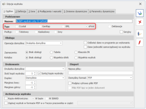 Typ wydruku można precyzyjnie określić poprzez wejście w edycję danego wydruku, gdzie na zakładce