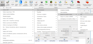 W tym celu w Comarch ERP Optima otwieramy np. formularz faktury i z menu dostępnego po kliknięciu na przycisk Wydruku danych wybieramy odpowiednio: szablon wydruku, eksport do pliku na dysk, a następnie format w jakim plik ma zostać zapisany.