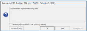 Po zapisie pliku na dysku w programie wyświetlane jest okno z komunikatem „Czy otworzyć wyeksportowany plik?” Użytkownik ma możliwość otworzenia pliku bezpośrednio z programu po naciśnięciu opcji „Tak”.
