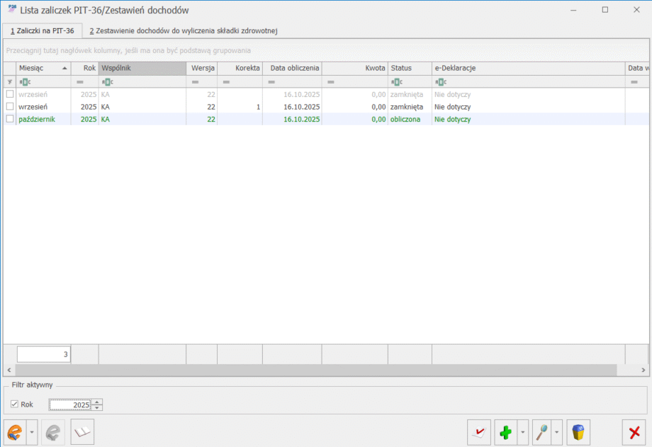Po zapisaniu, na liście deklaracji oprócz pierwotnej zaliczki, która zostanie wyświetlona w kolorze szarym, pojawi się dodatkowo korekta zaliczki. W kolumnie Korekta nowo powstały dokument otrzyma wartość oznaczającą kolejny numer korekty. W kolumnie Kwota dla korekt zaliczek podpowiada się kwota do zapłaty do US w całości, taka jak wychodzi na zaliczce – Kwota do zapłaty, np. z zaliczki na PIT-36 pole 63.