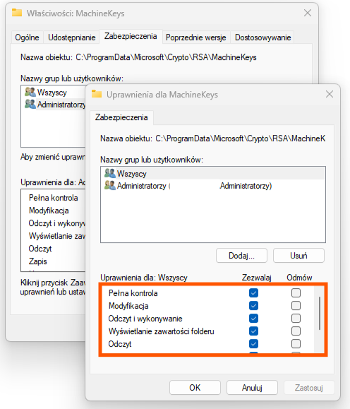 Przejść do C:\ProgramData\Microsoft\Crypto\RSA\MachineKeys i dla tego folderu nadać innym użytkownikom takie prawa jakie ma administrator.