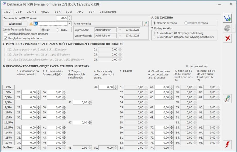 Pierwsza deklaracja PIT-28 musi być oznaczona jako złożenie zeznania – program nie pozwoli zapisać pierwszej deklaracji PIT-28 jako korekty zeznania.