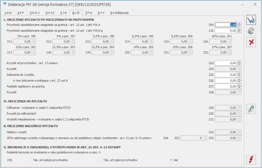 Formularz deklaracji PIT‑28 – sekcja L – O