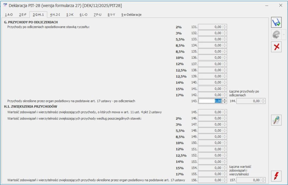 Kwota w poz. 143 Przychody określone przez organ podatkowy na podstawie art. 17 ustawy – po odliczeniach jest wyliczana przez program i podlega edycji.