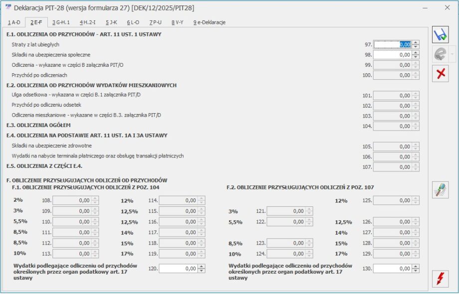 Formularz deklaracji PIT-28– sekcja E-F