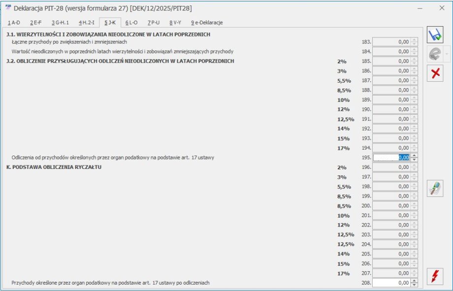 Formularz deklaracji PIT‑28 – sekcja J – K