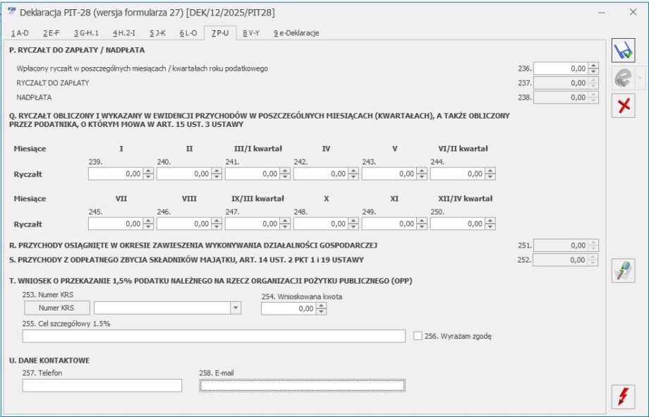 Formularz deklaracji PIT‑28 – sekcja P – U