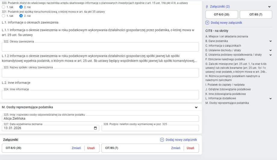 Z poziomu formularza korekty deklaracji CIT-8E istnieje możliwość dodania załącznika ORD-ZU. Po zaznaczeniu w poz. 8 Rodzaj korekty opcji korekta zeznania, o której mowa w art. 81b §1a Ordynacji podatkowej, pojawia się pole na wpisanie treści uzasadnienia przyczyny korekty.