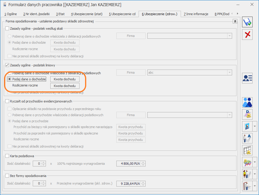 Jeżeli podstawa składki zdrowotnej właściciela ma być ustalona na podstawie danych o dochodzie pobranych z modułów księgowych należy na formularzu danych kadrowych właściciela na zakładce [Ubezpieczenie (zdrow.)] ustawić opcję ‘Zasady ogólne – podatek liniowy’ i zaznaczyć parametr ‘Pobieraj dane o dochodzie właściciela z deklaracji’ i wskazać Firmę, w której ten właściciel ma naliczany dochód.