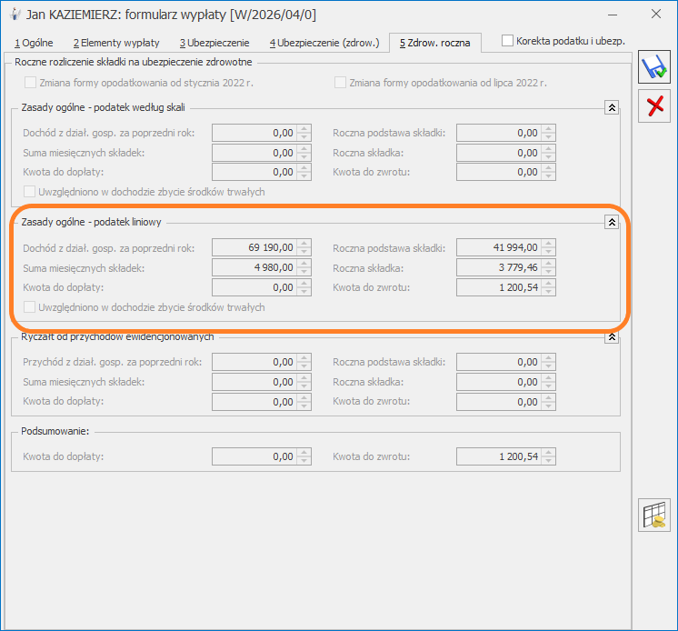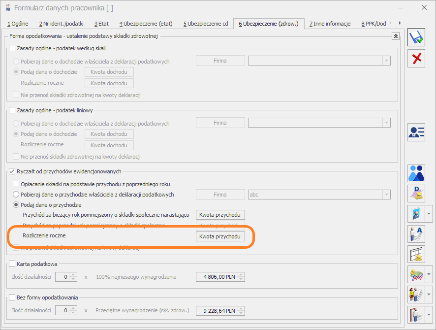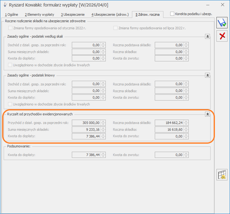 informacje dotyczące ustalenia podstawy składki zdrowotnej (zakładka [Ubezpieczenie (zdrow.)]).