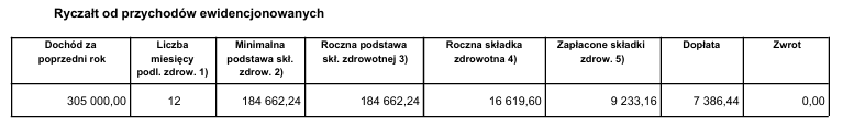 100% przeciętnego miesięcznego wynagrodzenia w sektorze przedsiębiorstw w czwartym kwartale roku poprzedniego, włącznie z wypłatami z zysku, jeżeli przychody z działalności gospodarczej przekroczyły 60 000 zł, ale nie przekroczyły 300 000 zł,