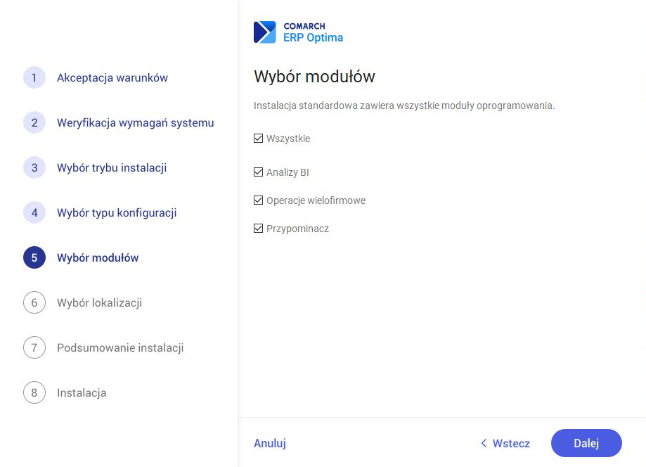 Wybór modułów dodatkowych - funkcja służy do zmiany dostępności modułów dodatkowych takich jak: Analizy BI, Automat Synchronizacji, Biuro Rachunkowe i Przypominacz. Jeżeli podane moduły nie były zaznaczone podczas instalacji Comarch ERP Optima, to z poziomu tej funkcji można je włączyć już po zakończeniu instalacji.