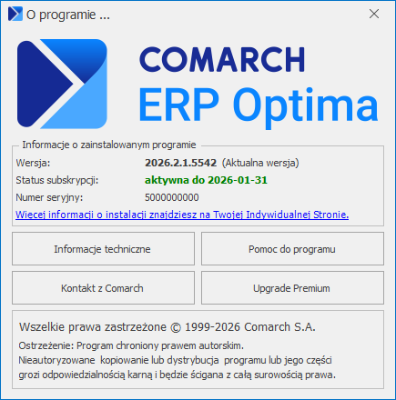 Na oknie widoczny jest również numer klucza na który nastąpiło logowanie oraz data ważności Upgrade Podstawowego.