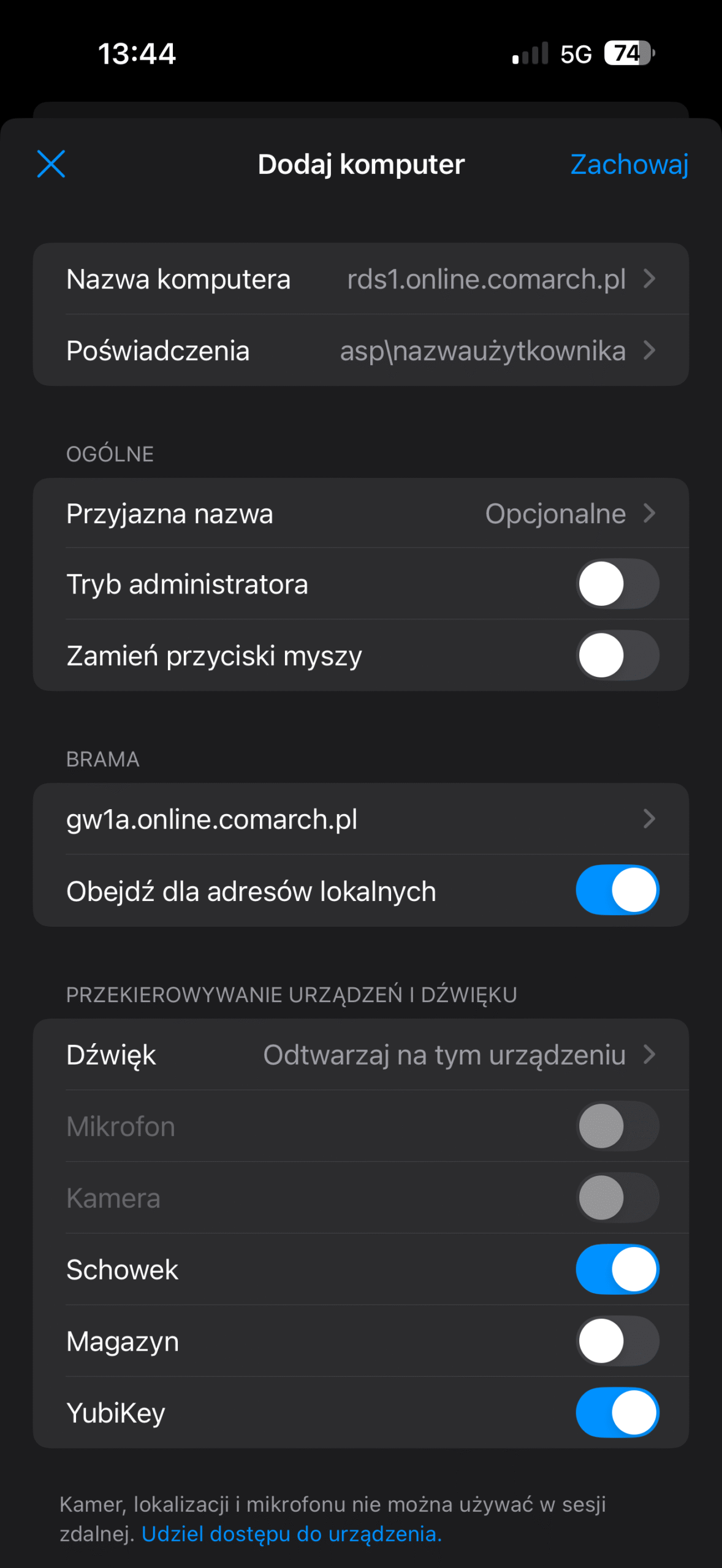 Konfiguracja klienta Microsoft Windows App na urządzeniach z systemem iOS dla Comarch ERP Optima Chmura Standard